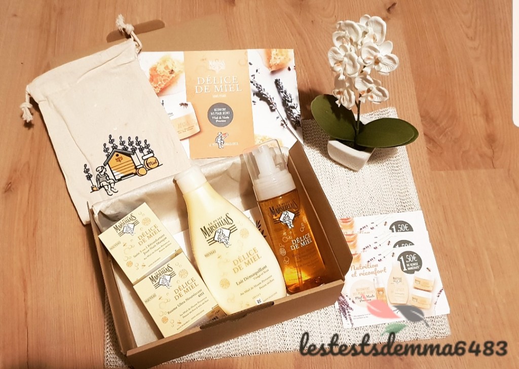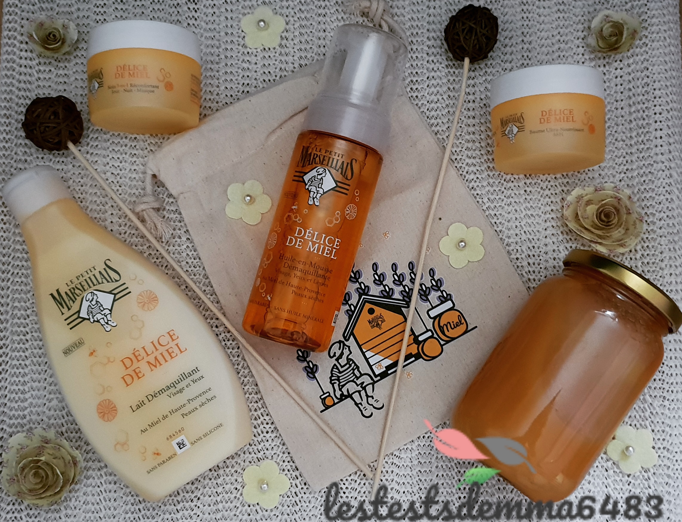 - Le lait démaquillant Délice de Miel : il nettoie,démaquille le visage et les yeux, il est conseillé pour les peaux sèches. Son doux parfum de miel est agréable, la peau est nourrie , douce .