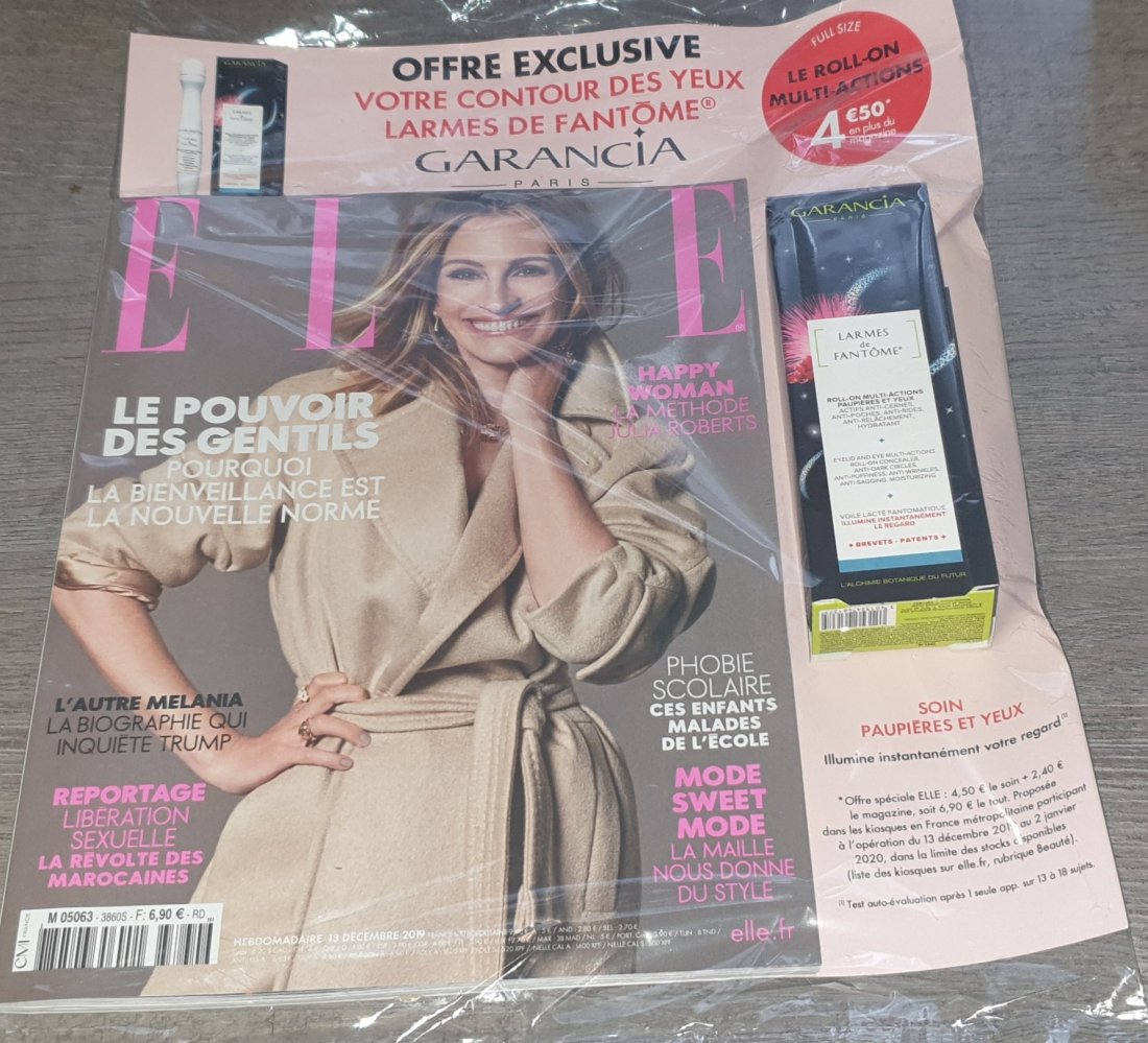 Pour 4âŹ50 en + de votre magazine Elle ( qui est au prix de 2âŹ40 )vous trouverez un roll-on de 10 ml,soin contour des yeux « Larmes de FantĂŽme »de la marque Garancia đș C’est LE contour des yeux qui fait vraiment TOUT !!!
