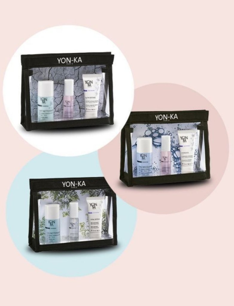 - La trousse Hydratation avec eau micellaire 30 ml,hydra n°1 crème 15 ml et lotion Yon-Ka 10 ml. Garant d’une peau repulpée,lissée et visiblement plus fraîche et plus jeune!