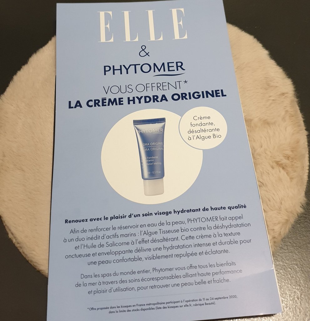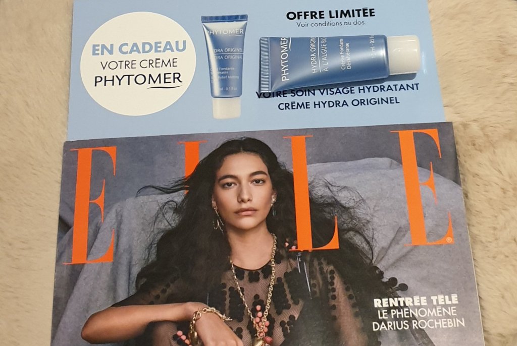Pour 2€50 ( prix du magazine ) une crème fondante désaltérante à l’algue bio pour le visage ,Hydra Originel de chez Phytomer de 15 ml en cadeau ( format voyage ) .