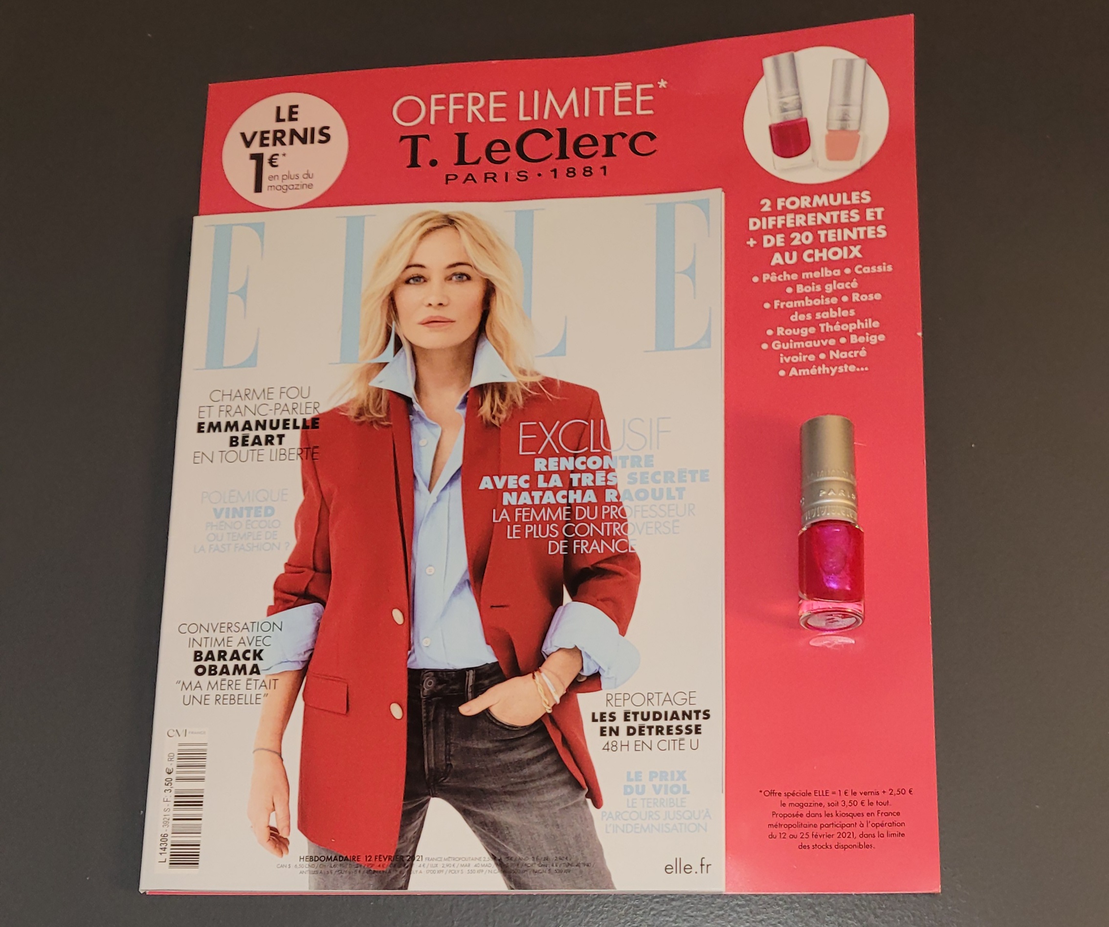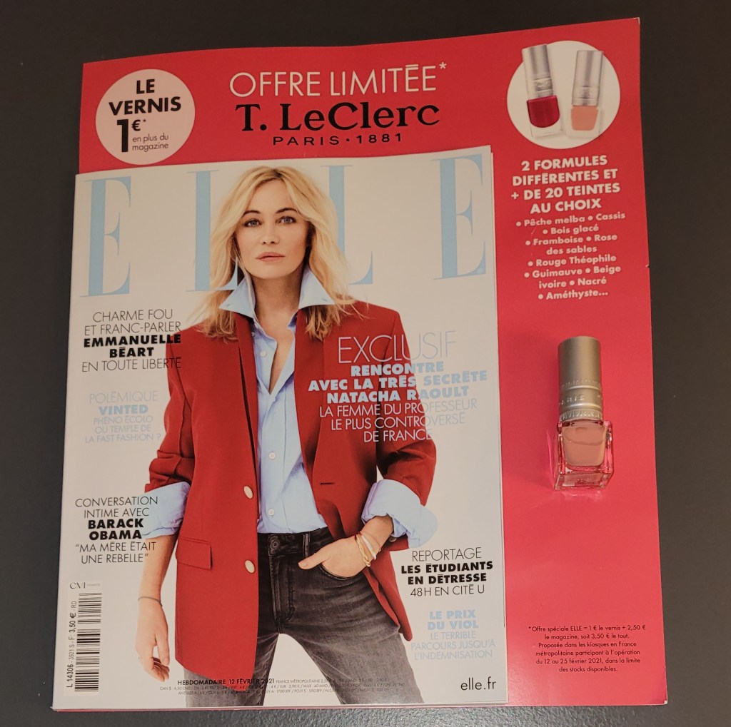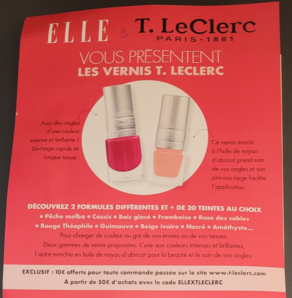 ~ Pour 1€ en + du prix du magazine ( soit 3€50 ) vous découvrirez un vernis à ongles T.Leclerc dans votre magazine Elle.