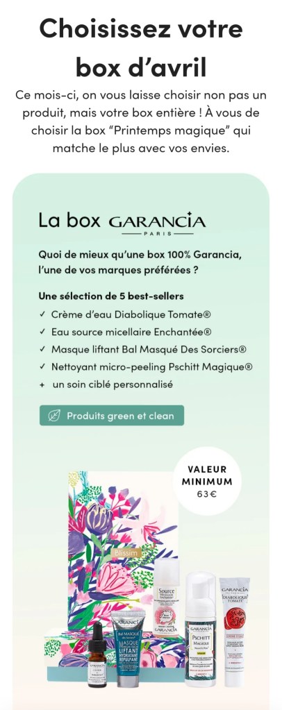Et la seconde ( si vous n’aimez pas les produits Garancia ) c’est une box multi-marques, valeur minimum 38 âŹ