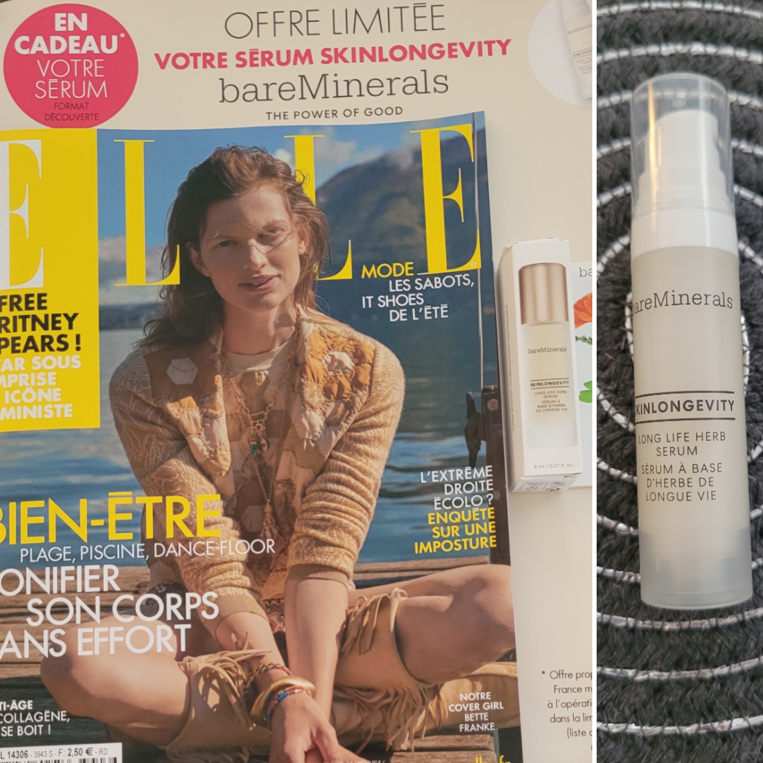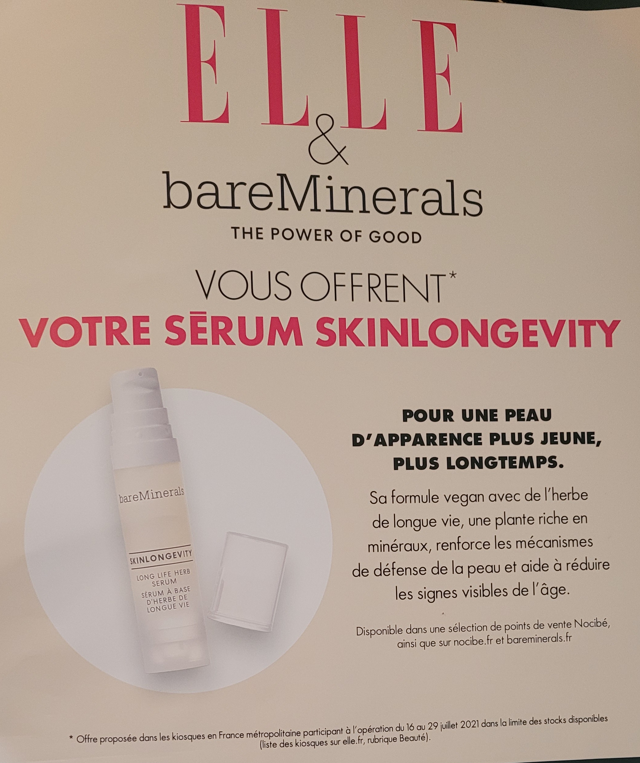En cadeau un sérum Skinlongevity de 8ml ( format découverte ) Bare Minerals à base d’herbe de longue vie.