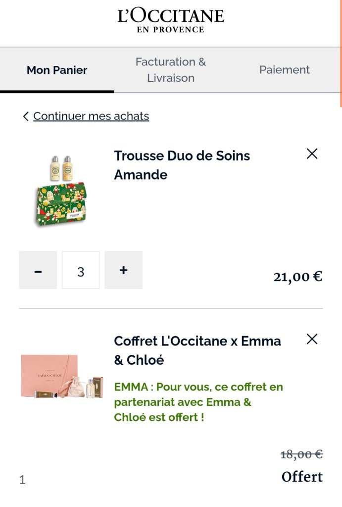 Dès 19€ d’achat sur le site de l’Occitane et avec le code EMMA un coffret Emma & Chloé ( en collaboration avec L’Occitane ) vous est offert 😍 C’est trop trop bien 🥰