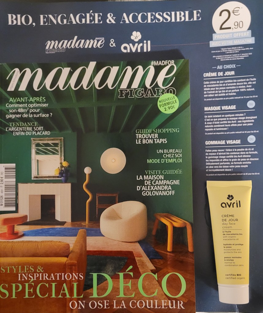 Quatrième bon plan c’est avec le magazine Madame Figaro qui vous offre une crème de la marque Avril, vous ne payez que le prix du magazine 😉