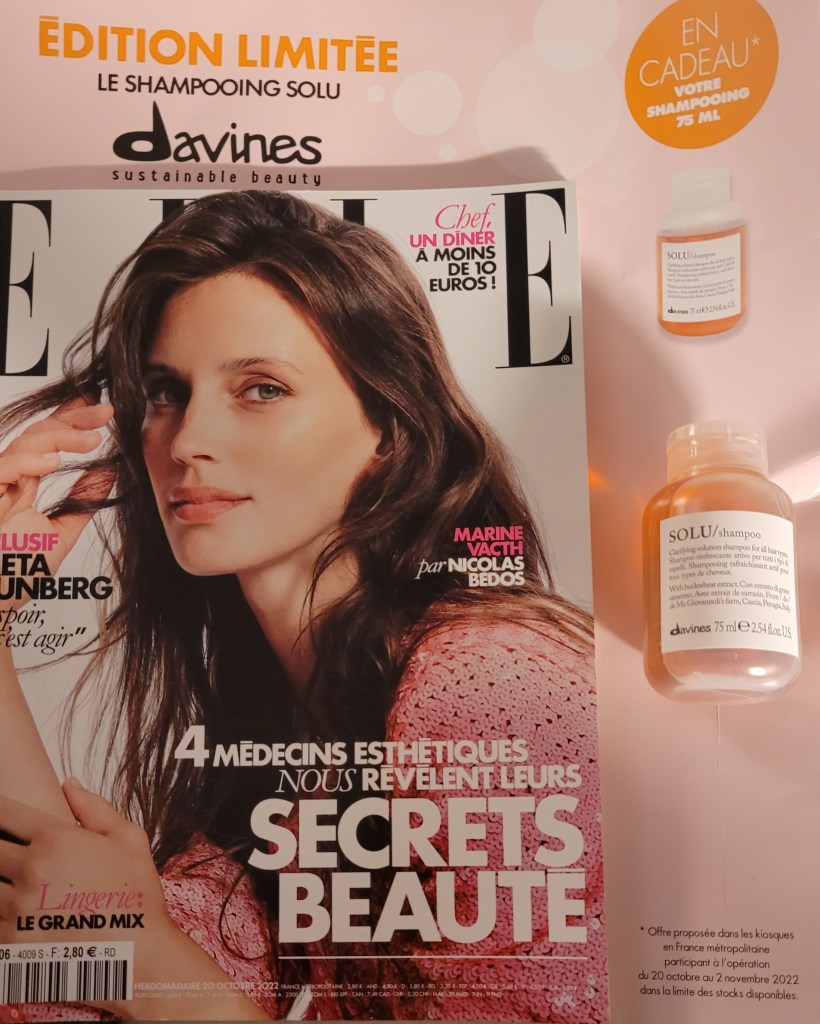 En premier, le magazine Elle qui propose en édition limitée un shampooing SOLU Davines en format 75 ml ☆