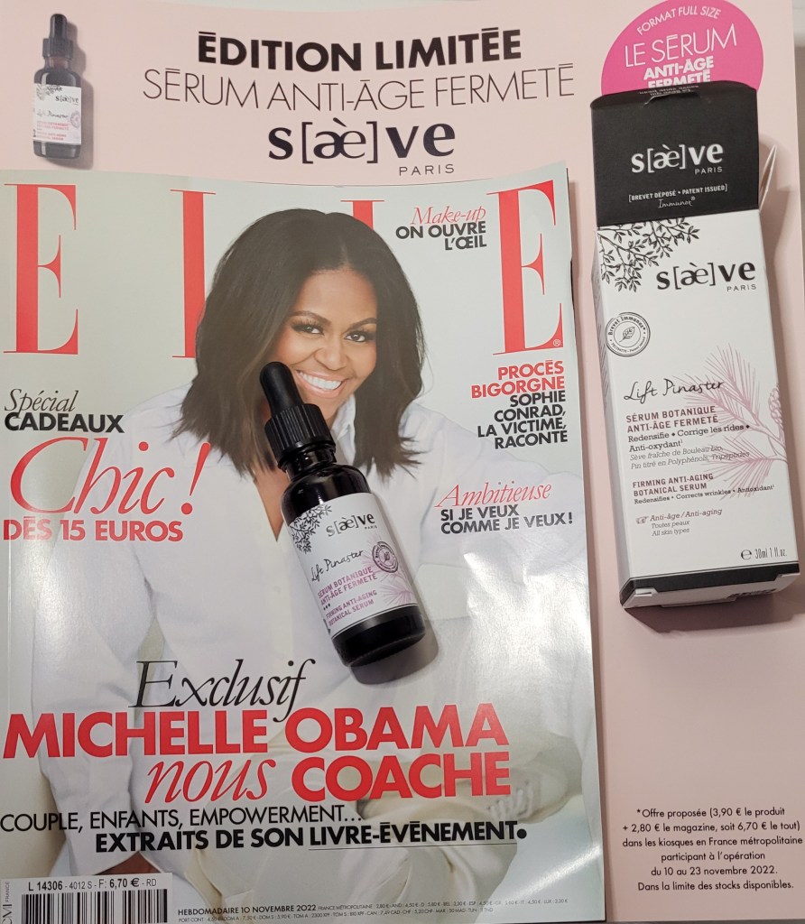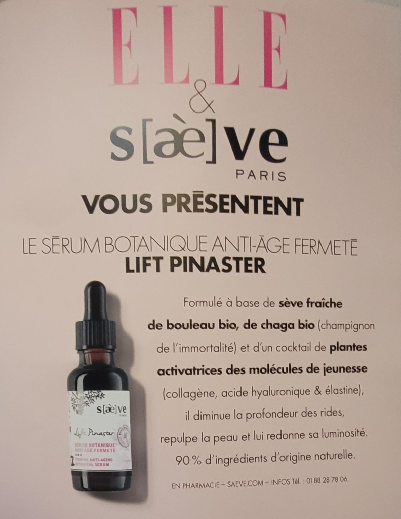 Pour 3,90€ en + du prix du magazine ( 2,80€ ) Elle vous propose le sérum botanique anti-âge fermeté de Saève ♡ Le Lift Pinaster . C’est un format full-size de 30 ml ( valeur : 45,50€ sur le site de Saève )