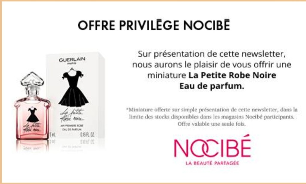 Sur simple présentation de la newsletter du magazine ELLE et sans obligation d’achat, Nocibé vous offre une miniature de l’eau de parfum La Petite Robe noire de Guerlain 👗