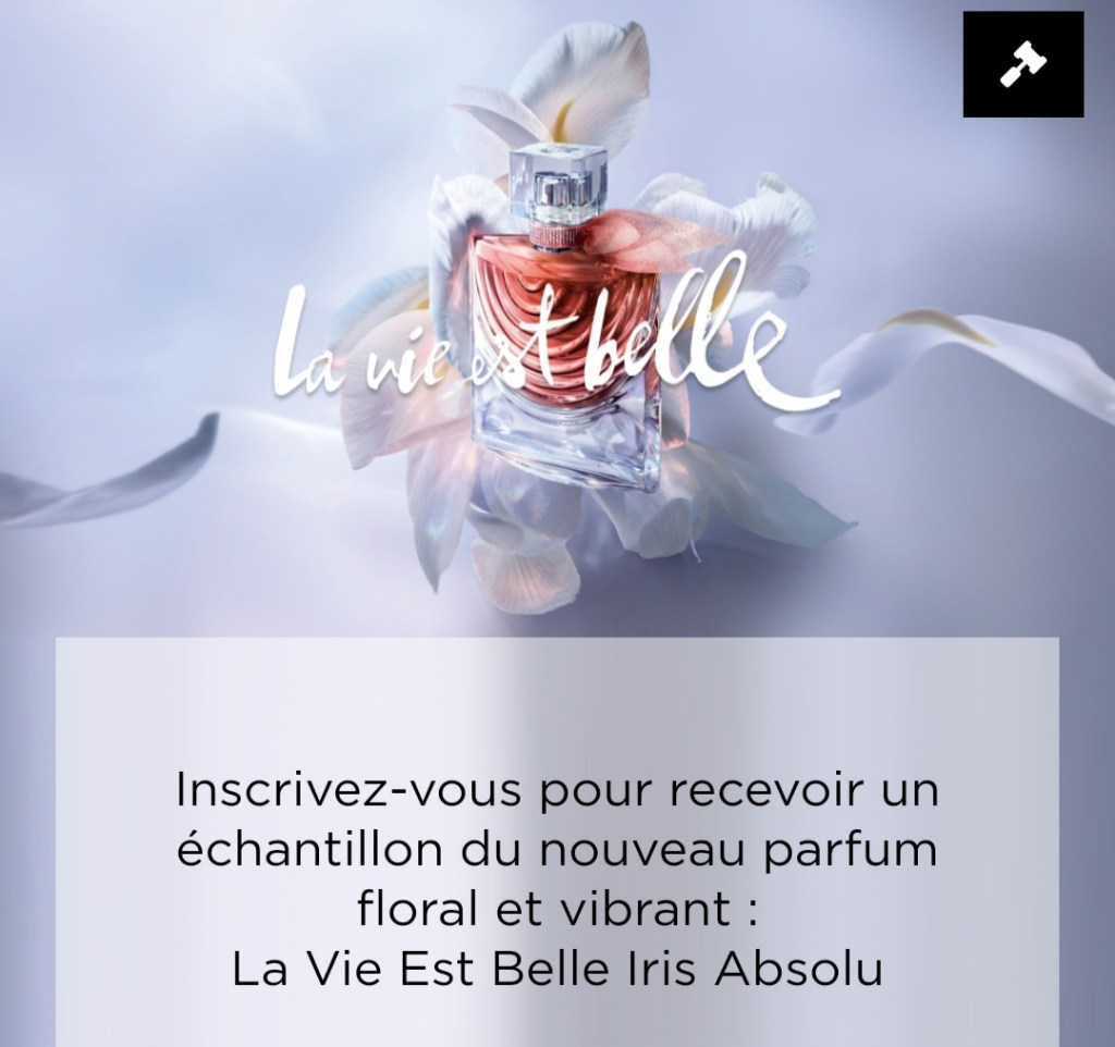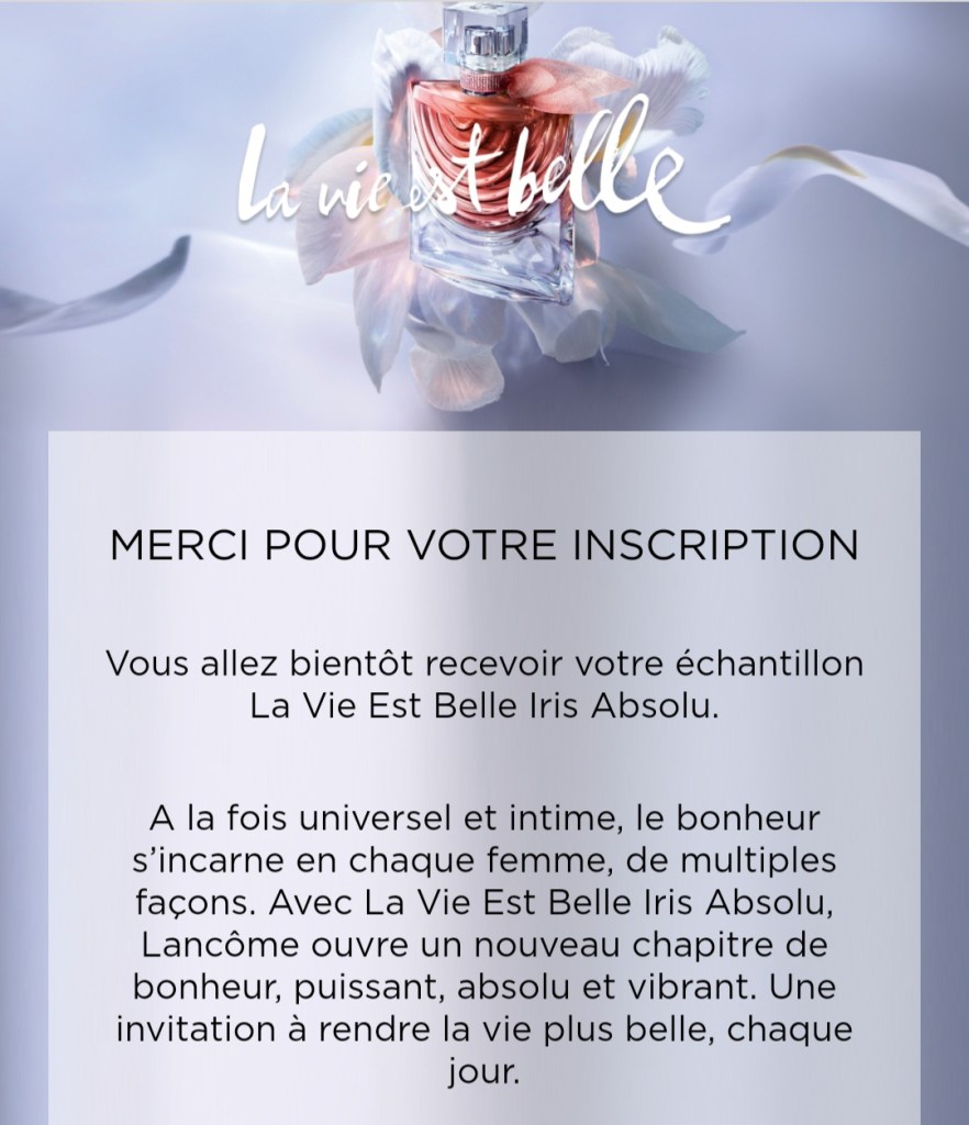 Et aujourd’hui, c’est Lancôme qui vous propose de recevoir gratuitement un échantillon du nouveau parfum La Vie Est Belle Iris Absolu 💞
